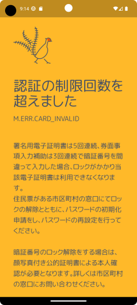 署名用電子証明書もしくは、券面事項入力補助のパスワードの間違い回数の上限を超えました。